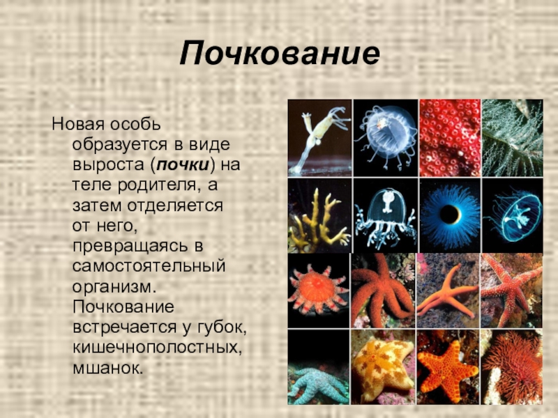 затем отделяется от него, превращаясь в самостоятельный организм. Почкование встречается у губок, кишечнополостных, мшанок.