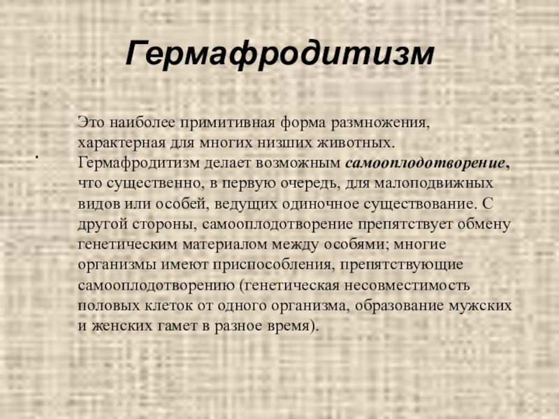 возможным самооплодотворение, что существенно, в первую очередь, для малоподвижных видов или особей, ведущих одиночное существование. С другой стороны, самооплодотворение препятствует обмену генетическим материалом между особями; многие организмы имеют приспособления, препятствующие самооплодотворению (генетическая несовместимость половых клеток от одного организма, образование мужских и женских гамет в разное время).