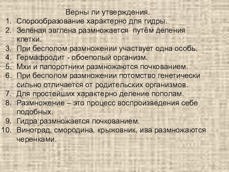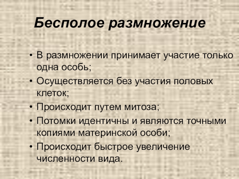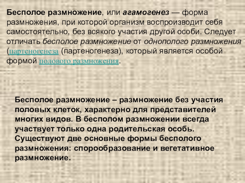 Слайд 10Бесполое размножение, или агамогенез — форма размножения, при которой организм воспроизводит