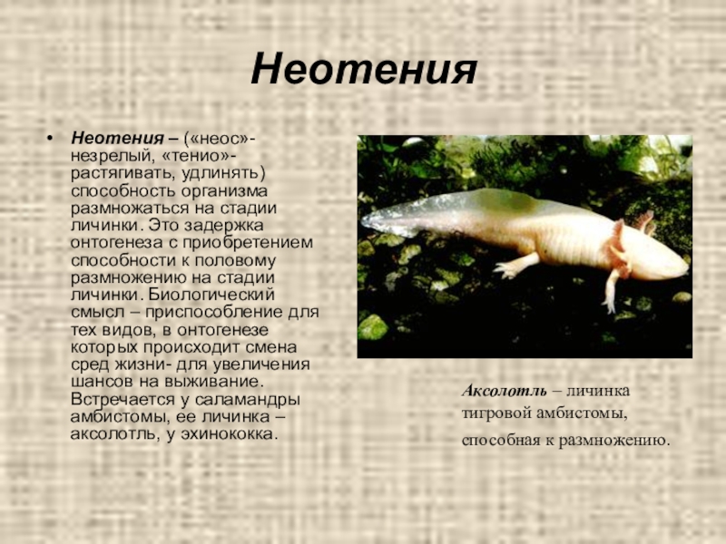 Неотения – («неос»- незрелый, «тенио»- растягивать, удлинять) способность организма размножаться на
