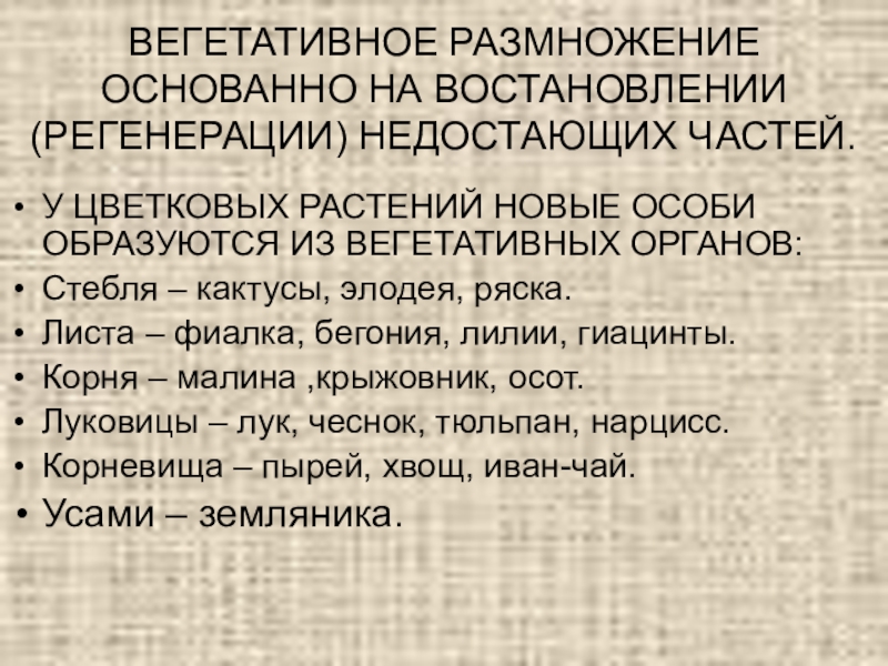 Слайд 27ВЕГЕТАТИВНОЕ РАЗМНОЖЕНИЕ ОСНОВАННО НА ВОСТАНОВЛЕНИИ (РЕГЕНЕРАЦИИ) НЕДОСТАЮЩИХ ЧАСТЕЙ.