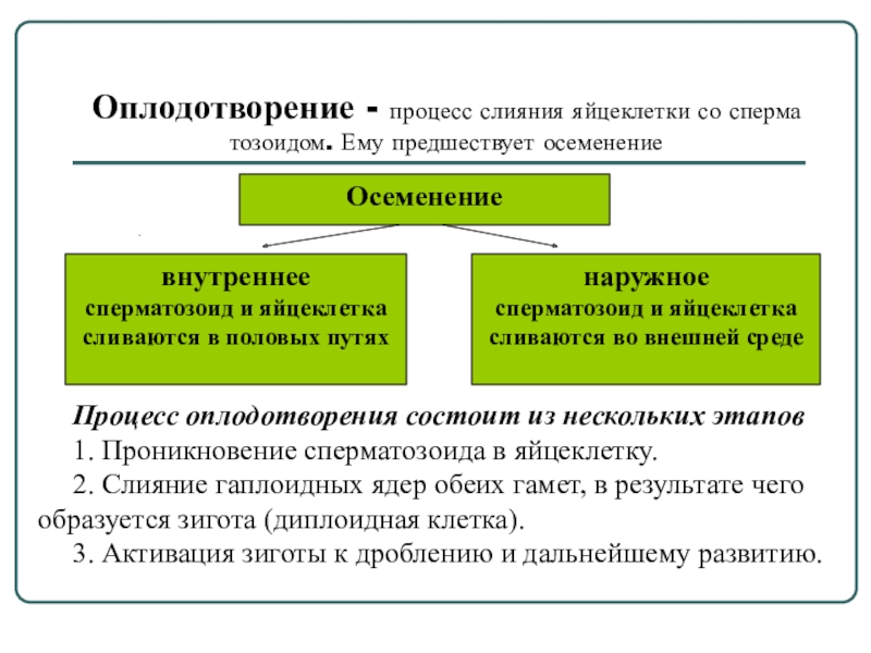 Оплодотворение - процесс слияния яйцеклетки со сперматозоидом. Ему предшествует осеменение