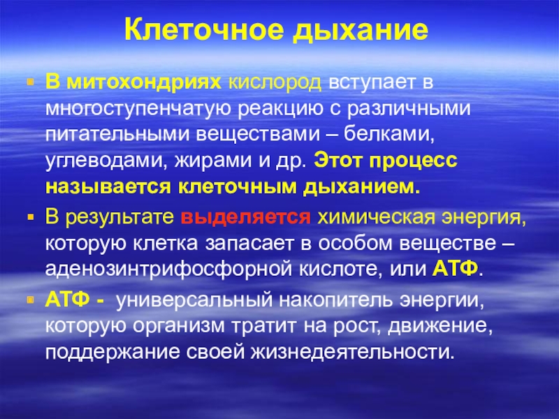 веществами – белками, углеводами, жирами и др. Этот процесс называется клеточным дыханием.