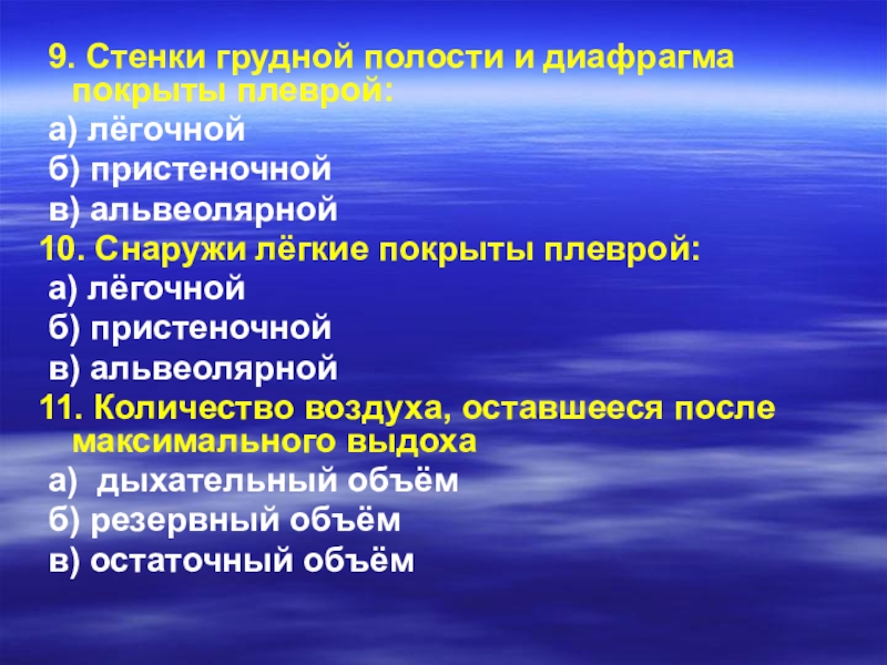 9. Стенки грудной полости и диафрагма покрыты плеврой: