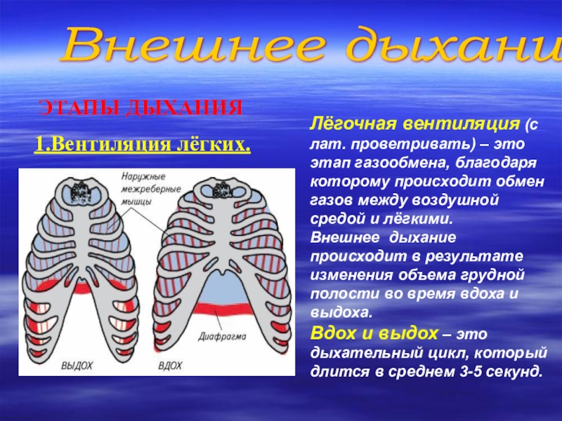 Внешнее дыхание происходит в результате изменения объема грудной полости во время вдоха и выдоха.