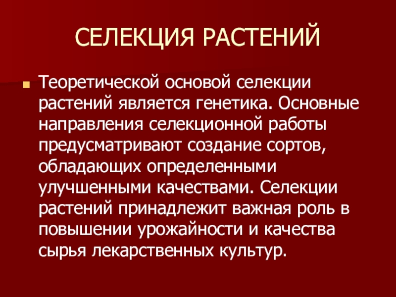 Теоретической основой селекции растений является генетика. Основные направления селекционной
