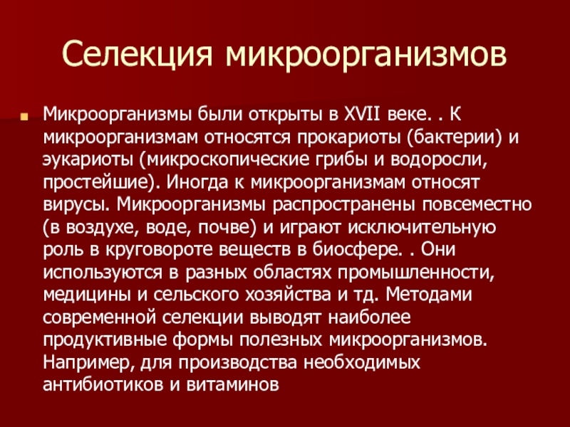 прокариоты (бактерии) и эукариоты (микроскопические грибы и водоросли, простейшие). Иногда к микроорганизмам относят вирусы. Микроорганизмы распространены повсеместно (в воздухе, воде, почве) и играют исключительную роль в круговороте веществ в биосфере. . Они используются в разных областях промышленности, медицины и сельского хозяйства и тд. Методами современной селекции выводят наиболее продуктивные формы полезных микроорганизмов. Например, для производства необходимых антибиотиков и витаминов