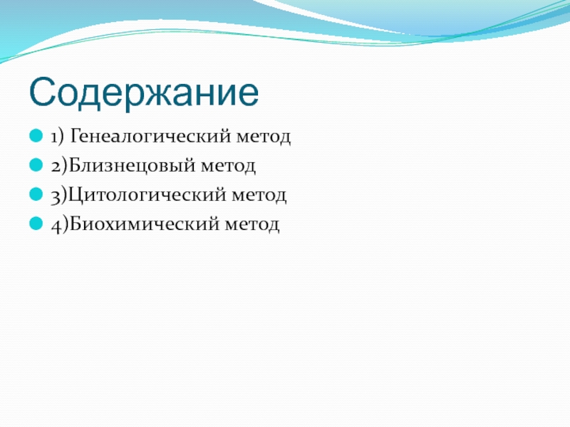 Содержание1) Генеалогический метод2)Близнецовый метод3)Цитологический метод4)Биохимический метод