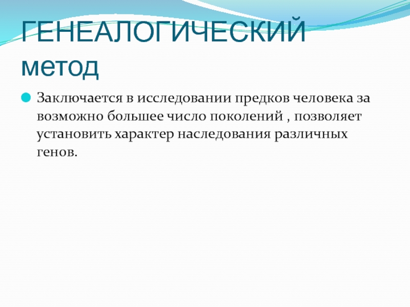 ГЕНЕАЛОГИЧЕСКИЙ методЗаключается в исследовании предков человека за возможно большее число поколений , позволяет установить характер наследования различных