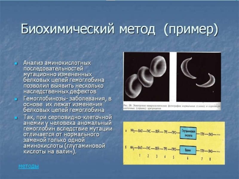 Биохимический методИзучают наследственно обусловленные нарушения обмена веществ