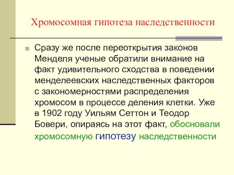 на факт удивительного сходства в поведении менделеевских наследственных факторов с закономерностями распределения хромосом в процессе деления клетки. Уже в 1902 году Уильям Сеттон и Теодор Бовери, опираясь на этот факт, обосновали хромосомную гипотезу наследственности