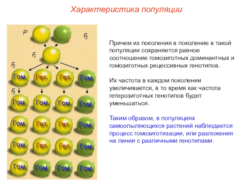 Горох – самоопылитель. В популяциях самоопыляющихся растений наблюдается процесс гомозиготизации, или разложения на линии с различными генотипами.