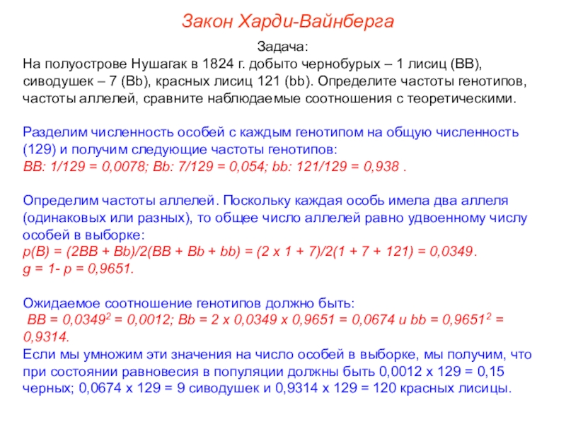 лисиц (ВВ), сиводушек – 7 (Вb), красных лисиц 121 (bb). Определите частоты генотипов, частоты аллелей, сравните наблюдаемые соотношения с теоретическими.