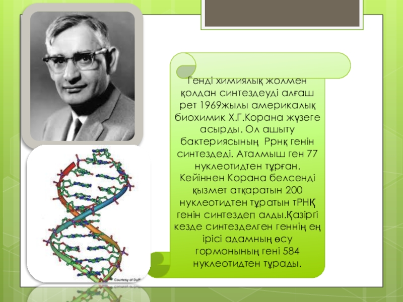 Слайд 9Генді химиялық жолмен қолдан синтездеуді алғаш рет 1969жылы америкалық биохимик Х.Г.Корана