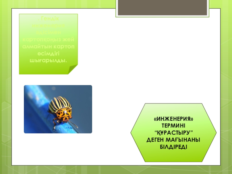 «Инженерия» термині “құрастыру” деген мағынаны білдіреді. Гендік инженерия әдісімен картопқоңыз жей алмайтын картоп өсімдігі шығарылды.