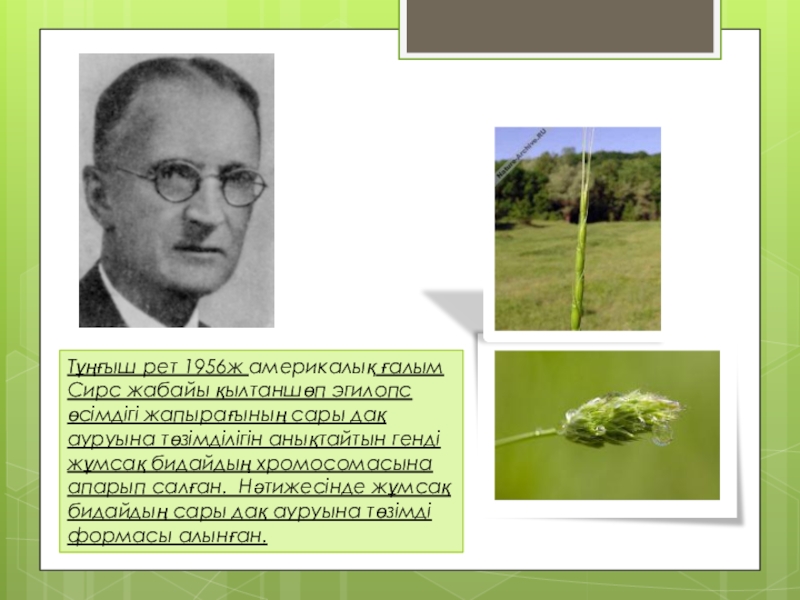 Слайд 3Тұңғыш рет 1956ж америкалық ғалым Сирс жабайы қылтаншөп эгилопс өсімдігі жапырағының
