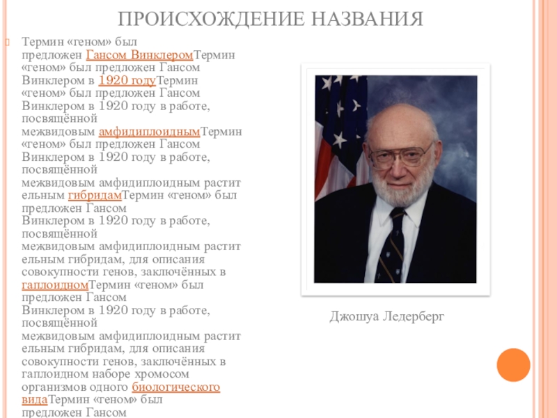 был предложен Гансом Винклером в 1920 году в работе, посвящённой межвидовым амфидиплоиднымТермин «геном» был предложен Гансом Винклером в 1920 году в работе, посвящённой межвидовым амфидиплоидным растительным гибридамТермин «геном» был предложен Гансом Винклером в 1920 году в работе, посвящённой межвидовым амфидиплоидным растительным гибридам, для описания совокупности генов, заключённых в гаплоидномТермин «геном» был предложен Гансом Винклером в 1920 году в работе, посвящённой межвидовым амфидиплоидным растительным гибридам, для описания совокупности генов, заключённых в гаплоидном наборе хромосом организмов одного биологического видаТермин «геном» был предложен Гансом Винклером в 1920 году в работе, посвящённой межвидовым амфидиплоидным растительным гибридам, для описания совокупности генов, заключённых в гаплоидном наборе хромосом организмов одного биологического вида. В Оксфордском энциклопедическом словаре указано, что термин образован слияниемТермин «геном» был предложен Гансом Винклером в 1920 году в работе, посвящённой межвидовым амфидиплоидным растительным гибридам, для описания совокупности генов, заключённых в гаплоидном наборе хромосом организмов одного биологического вида. В Оксфордском энциклопедическом словаре указано, что термин образован слиянием слов «ген» и «хромосома». ОднакоДжошуа ЛедербергТермин «геном» был предложен Гансом Винклером в 1920 году в работе, посвящённой межвидовым амфидиплоидным растительным гибридам, для описания совокупности генов, заключённых в гаплоидном наборе хромосом организмов одного биологического вида. В Оксфордском энциклопедическом словаре указано, что термин образован слиянием слов «ген» и «хромосома». ОднакоДжошуа Ледерберг и Алекса T. МакКрэй считают, что ботаник Г.Винклер должен был быть знаком с ботаническими терминами «ризом», «таллом», «трахеом» и т. д. Все эти термины возникли до 20-х годов XX века, и суффикс «-ом» в них означает объединение частей в целое, например, «ризом» означает всю корневую систему растения. Таким образом, «геном» можно понимать как объединение генов в целое.