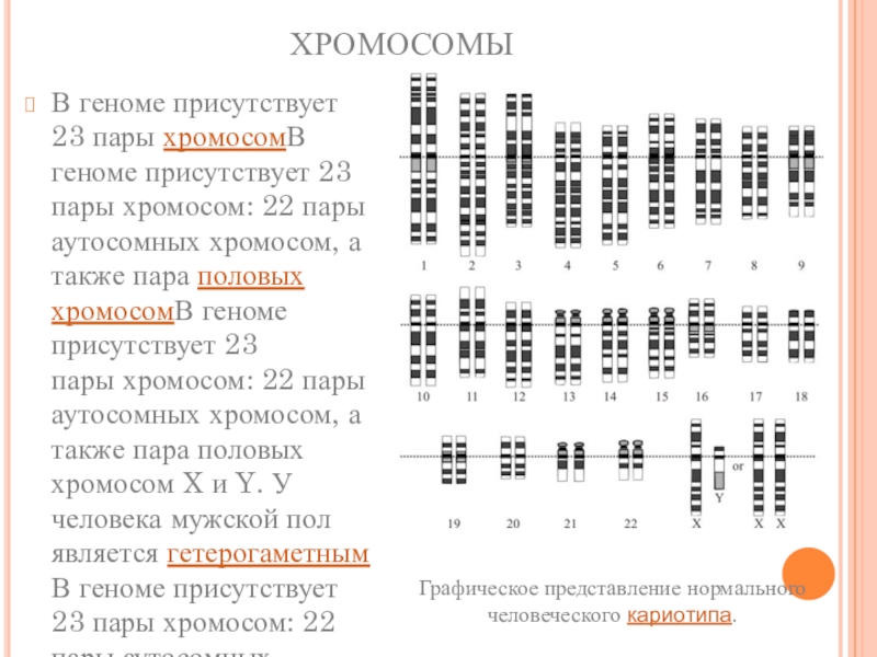 аутосомных хромосом, а также пара половых хромосомВ геноме присутствует 23 пары хромосом: 22 пары аутосомных хромосом, а также пара половых хромосом X и Y. У человека мужской пол является гетерогаметнымВ геноме присутствует 23 пары хромосом: 22 пары аутосомных хромосом, а также пара половых хромосом X и Y. У человека мужской пол является гетерогаметным и определяется наличием Y хромосомы. Нормальные диплоидныеВ геноме присутствует 23 пары хромосом: 22 пары аутосомных хромосом, а также пара половых хромосом X и Y. У человека мужской пол является гетерогаметным и определяется наличием Y хромосомы. Нормальные диплоидные соматические клетки имеют 46 хромосом.