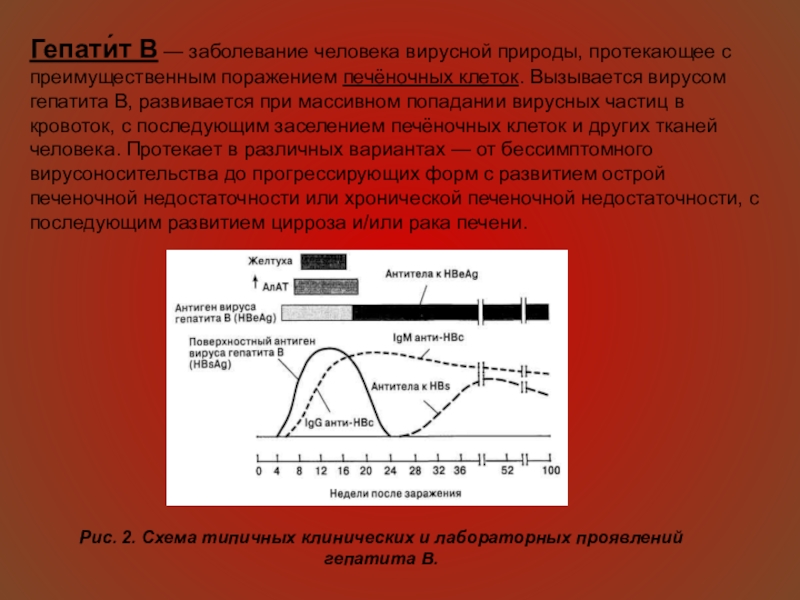 Рис. 2. Схема типичных клинических и лабораторных проявлений гепатита В.