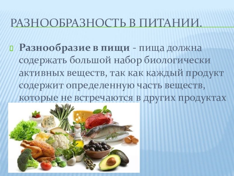Разнообразие в пищи - пища должна содержать большой набор биологически