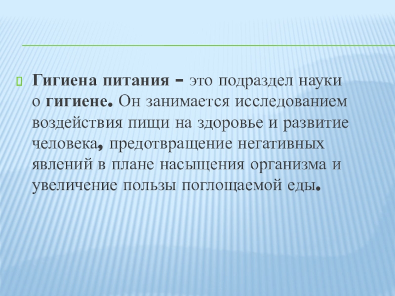 Слайд 2Гигиена питания – это подраздел науки о гигиене. Он занимается исследованием воздействия пищи