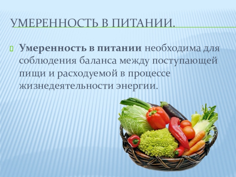 Умеренность в питании.Умеренность в питании необходима для соблюдения баланса между поступающей пищи и расходуемой в процессе жизнедеятельности энергии.
