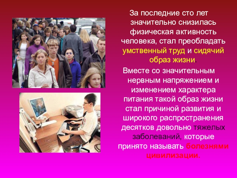 Слайд 2За последние сто лет значительно снизилась физическая активность человека, стал преобладать