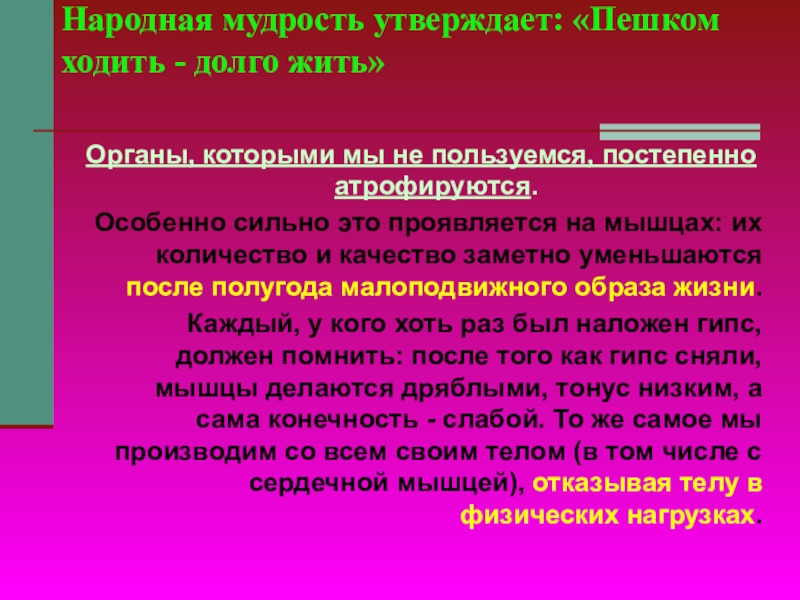 Слайд 6Народная мудрость утверждает: «Пешком ходить - долго жить»