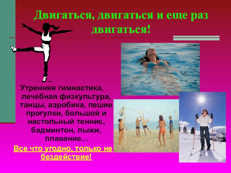 аэробика, пешие прогулки, большой и настольный теннис, бадминтон, лыжи, плавание...