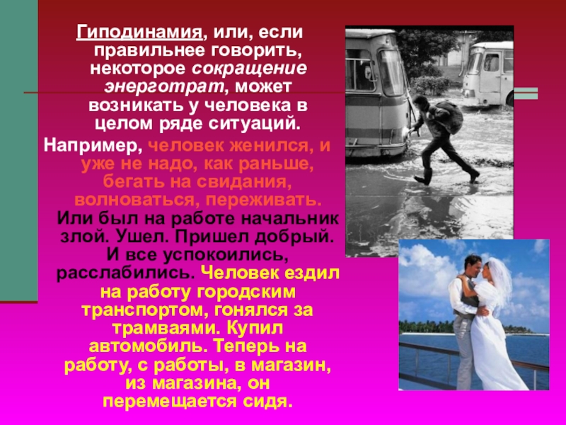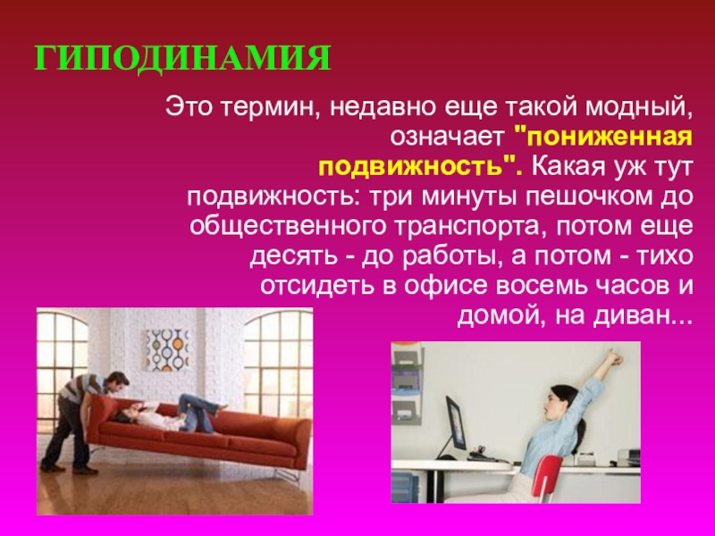 Слайд 4 Гиподинамия, или, если правильнее говорить, некоторое сокращение энерготрат, может возникать