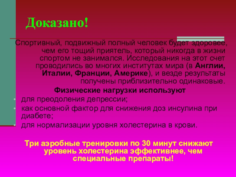 никогда в жизни спортом не занимался. Исследования на этот счет проводились во многих институтах мира (в Англии, Италии, Франции, Америке), и везде результаты получены приблизительно одинаковые.