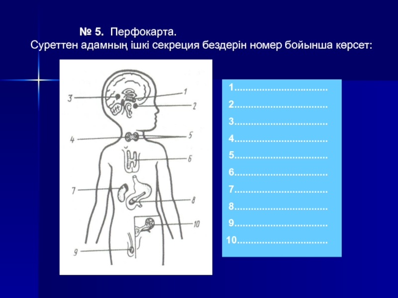 5. Қалқанша маңы безі; 10. Аналық жыныс безі;