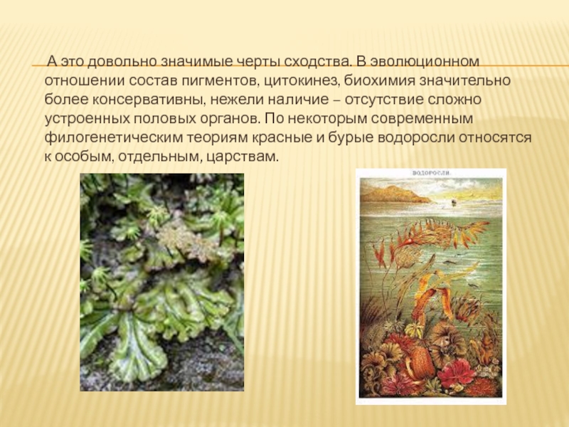 эволюционном отношении состав пигментов, цитокинез, биохимия значительно более консервативны, нежели наличие – отсутствие сложно устроенных половых органов. По некоторым современным филогенетическим теориям красные и бурые водоросли относятся к особым, отдельным, царствам.