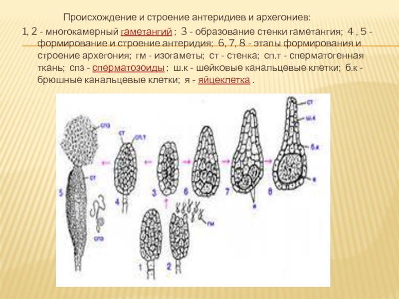 1, 2 - многокамерный гаметангий ; 3 - образование стенки гаметангия; 4 , 5 -формирование и строение антеридия; 6, 7, 8 - этапы формирования и строение архегония; гм - изогаметы; ст - стенка; сп.т - сперматогенная ткань; спз - сперматозоиды ; ш.к - шейковые канальцевые клетки; б.к - брюшные канальцевые клетки; я - яйцеклетка .