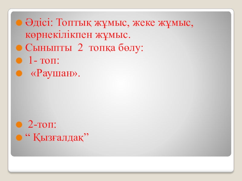 Әдісі: Топтық жұмыс, жеке жұмыс, көрнекілікпен жұмыс.