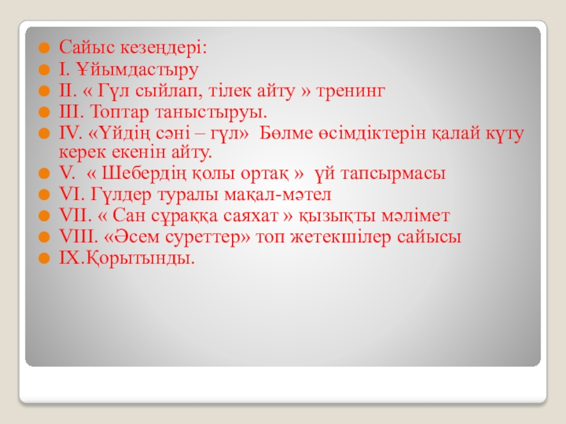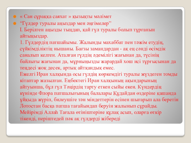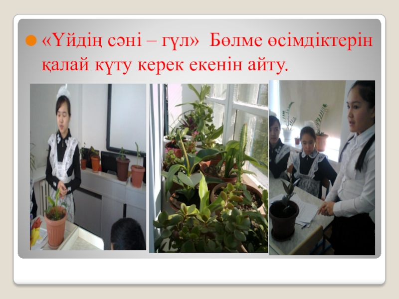 сәндік, бөлме, далалық гүлдердің түрлерін ажырата білуге, олардың табиғаттағы және адам өміріндегі маңызы туралы айту. Оқушыларға өсімдіктер дүниесіндегі ең маңызды бөлігі – өміріне сән беретін гүлге деген сезімін оята білу, ұғым беру. Гүлді өсімдіктер және олардың маңызы туралы білімдерін дамыту;Гүлдерді өсіре білуге, күтіп-баптауға үйрету. Эстетикалық тәрбие беру