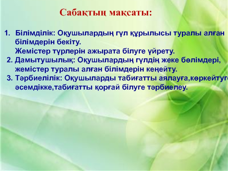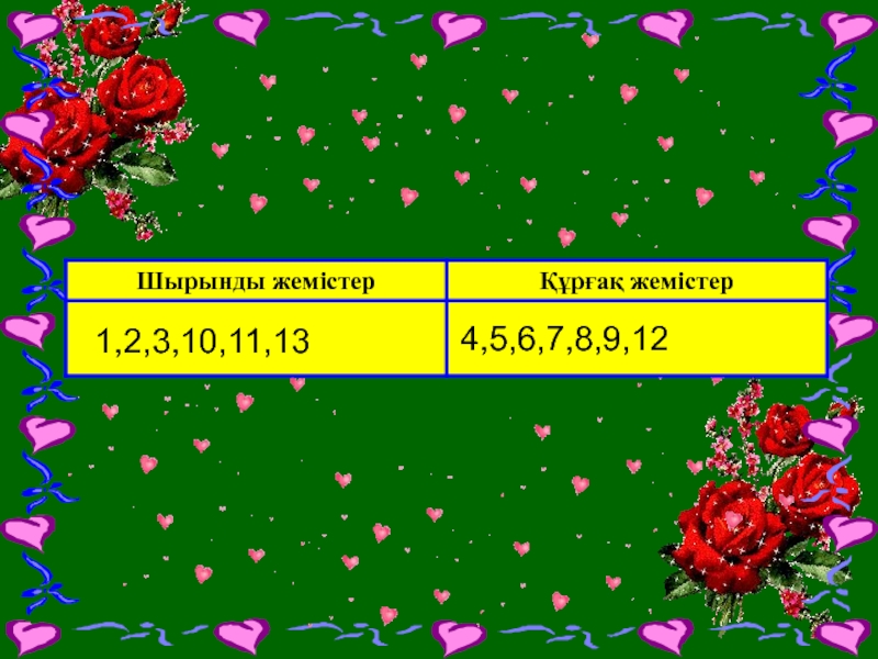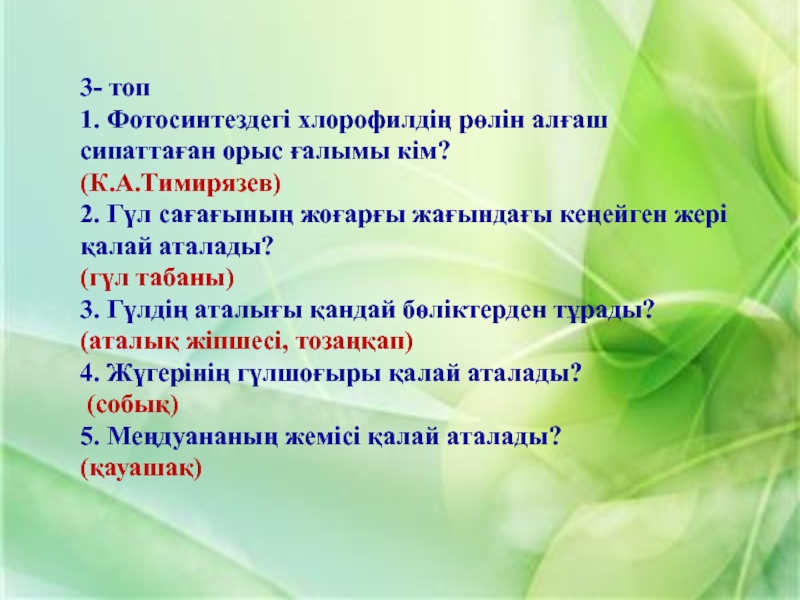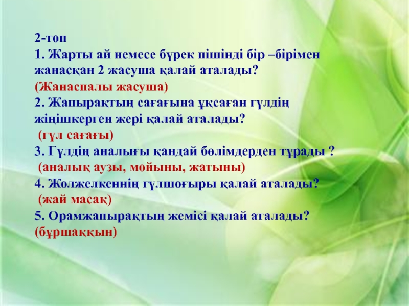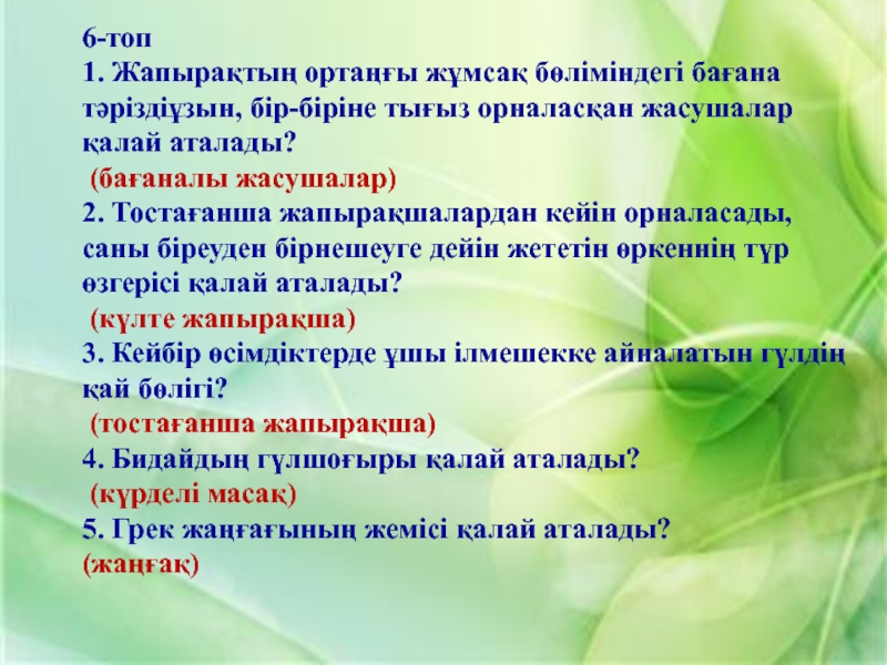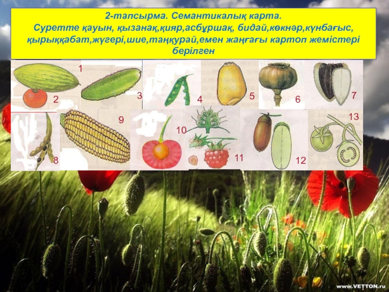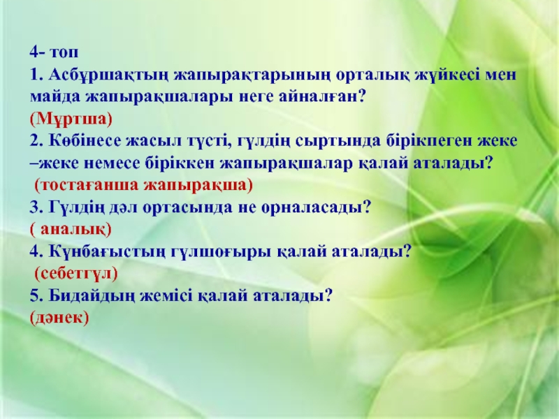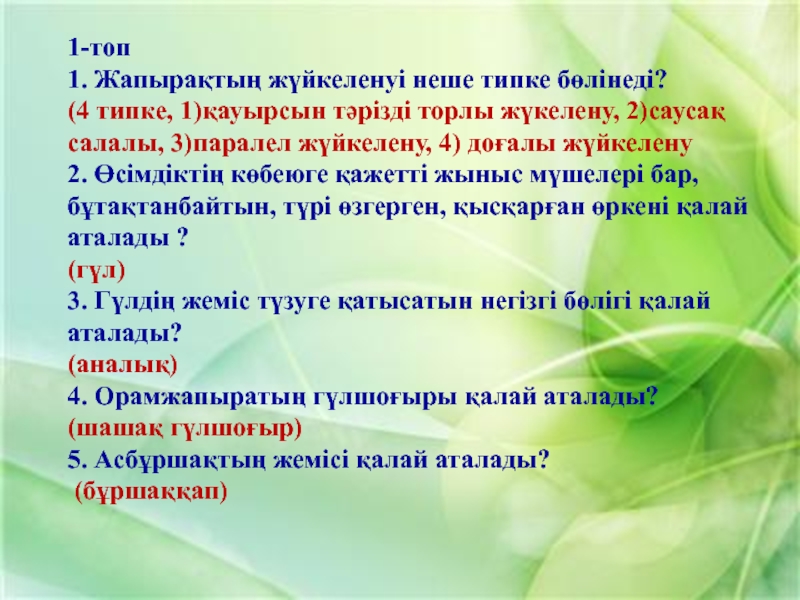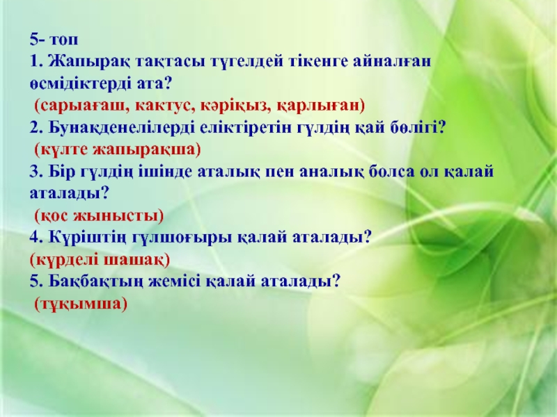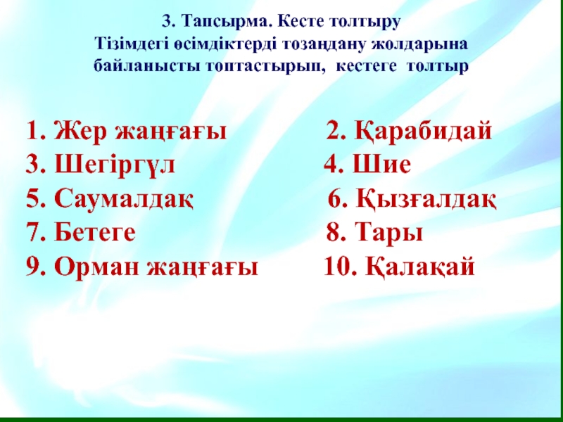 1. Жер жаңғағы 2. Қарабидай 3. Шегіргүл 4. Шие 5. Саумалдақ 6. Қызғалдақ 7. Бетеге 8. Тары 9. Орман жаңғағы 10. Қалақай