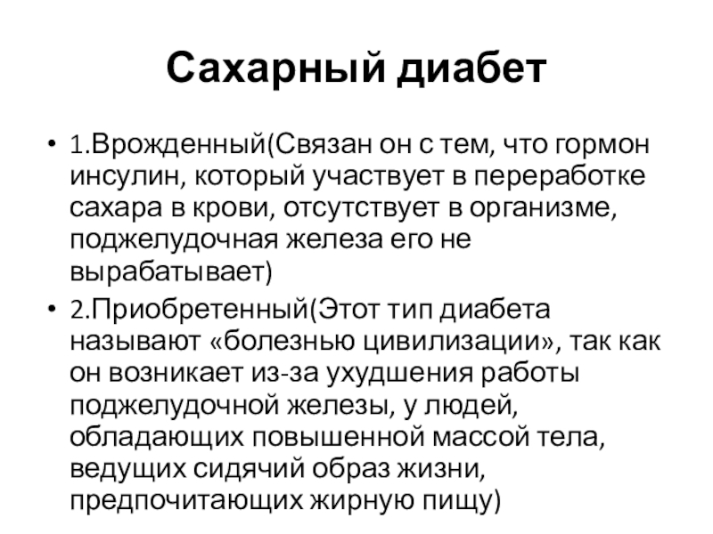 2.Приобретенный(Этот тип диабета называют «болезнью цивилизации», так как он возникает из-за ухудшения работы поджелудочной железы, у людей, обладающих повышенной массой тела, ведущих сидячий образ жизни, предпочитающих жирную пищу)