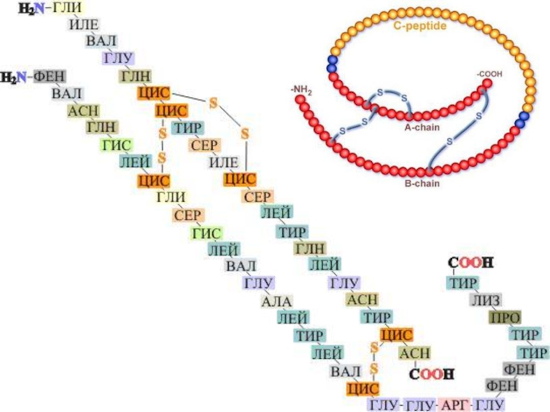 железы являются местом образования вещества , регулирующего углеводный обмен в организме. В 1921 году Ф.Батинг и Бест получили экстракт из островковой ткани поджелудочной железы, содержащей инсулин . В 1955 году Сенгер изучил аминокислотную последовательность и установил структуру инсулина крупного рогатого скота и свиней.