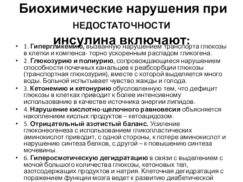 Биохимические нарушения при НЕДОСТАТОЧНОСТИ инсулина включают:1. Гипергликемию, вызванную нарушением транспорта глюкозы в клетки и компенса- торно