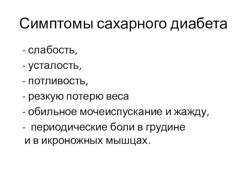 Симптомы сахарного диабета  - слабость,  - усталость,  - потливость,  - резкую потерю веса