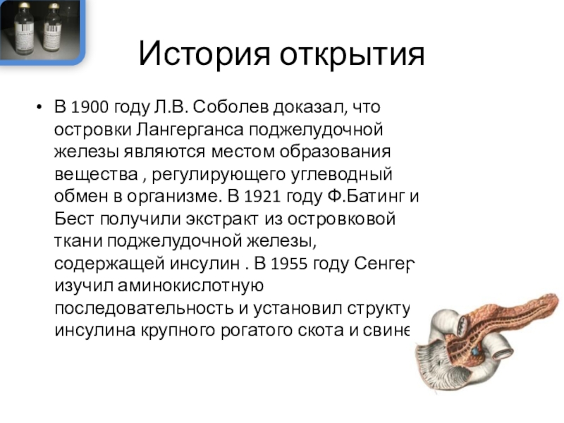 История открытияВ 1900 году Л.В. Соболев доказал, что островки Лангерганса поджелудочной железы являются местом образования вещества , регулирующего углеводный обмен в организме. В 1921 году Ф.Батинг и Бест получили экстракт из островковой ткани поджелудочной железы, содержащей