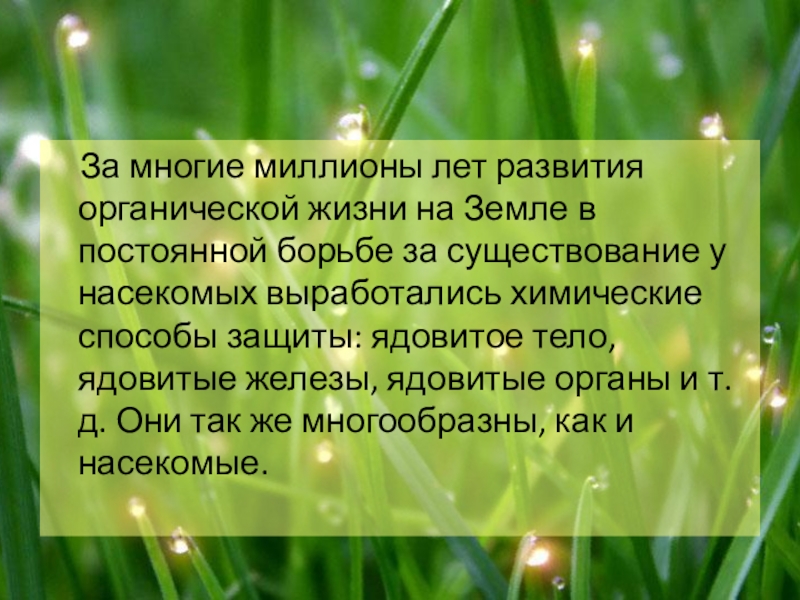 в постоянной борьбе за существование у насекомых выработались химические способы защиты: ядовитое тело, ядовитые железы, ядовитые органы и т. д. Они так же многообразны, как и насекомые.