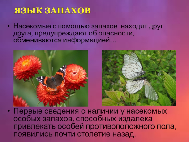 Слайд 2Насекомые с помощью запахов находят друг друга, предупреждают об опасности, обмениваются