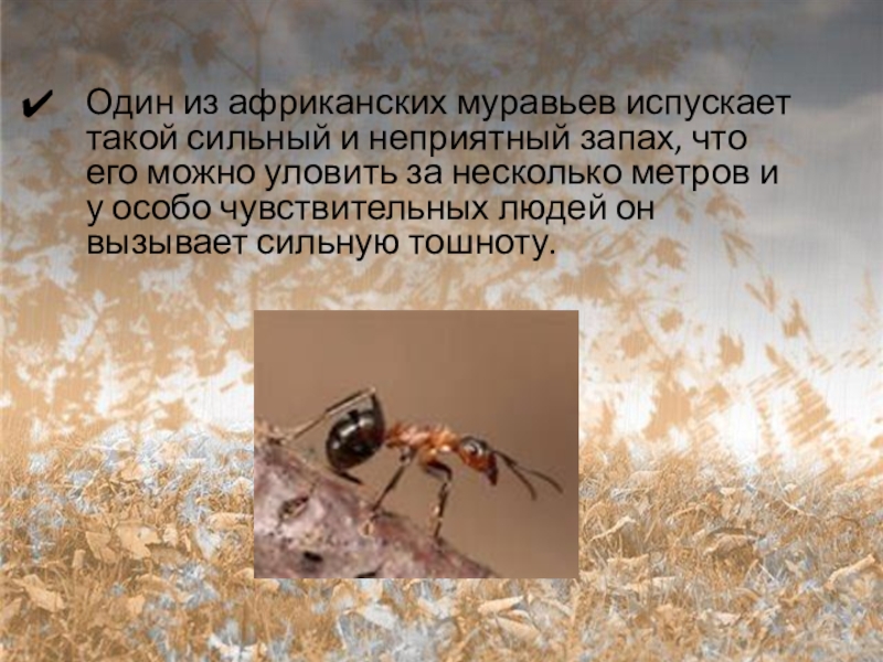 Слайд 24Один из африканских муравьев испускает такой сильный и неприятный запах, что