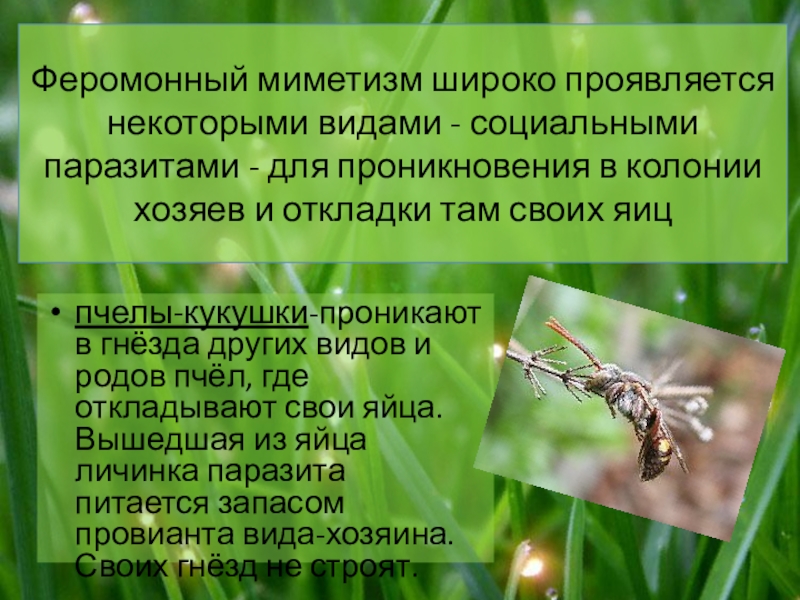 Слайд 14Феромонный миметизм широко проявляется некоторыми видами - социальными паразитами - для