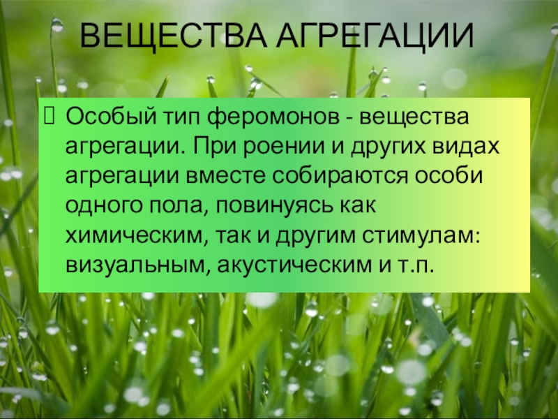видах агрегации вместе собираются особи одного пола, повинуясь как химическим, так и другим стимулам: визуальным, акустическим и т.п.