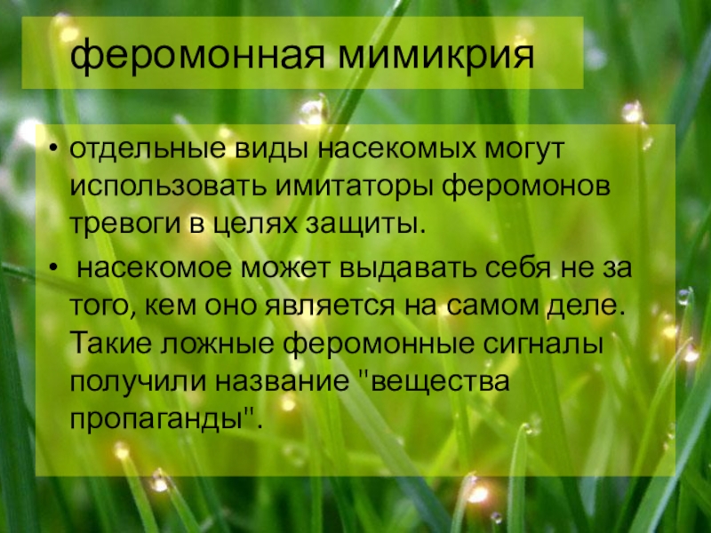 насекомое может выдавать себя не за того, кем оно является на самом деле. Такие ложные феромонные сигналы получили название "вещества пропаганды".