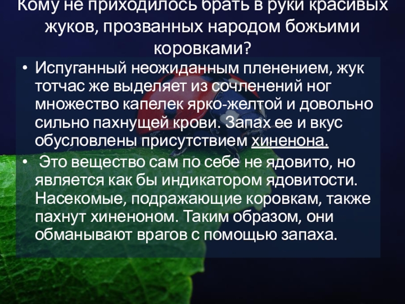 Слайд 23Кому не приходилось брать в руки красивых жуков, прозванных народом божьими