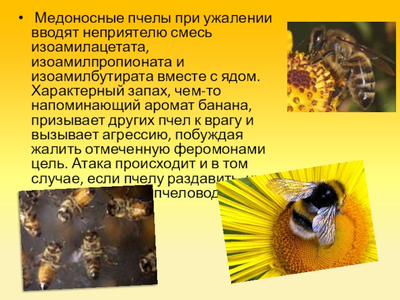 Слайд 11 Медоносные пчелы при ужалении вводят неприятелю смесь изоамилацетата, изоамилпропионата и